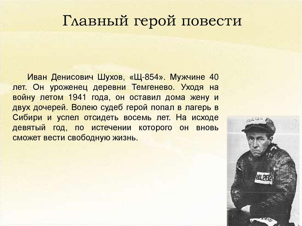 Главный герой повестиИван Денисович Шухов, «Щ-854». Мужчине 40