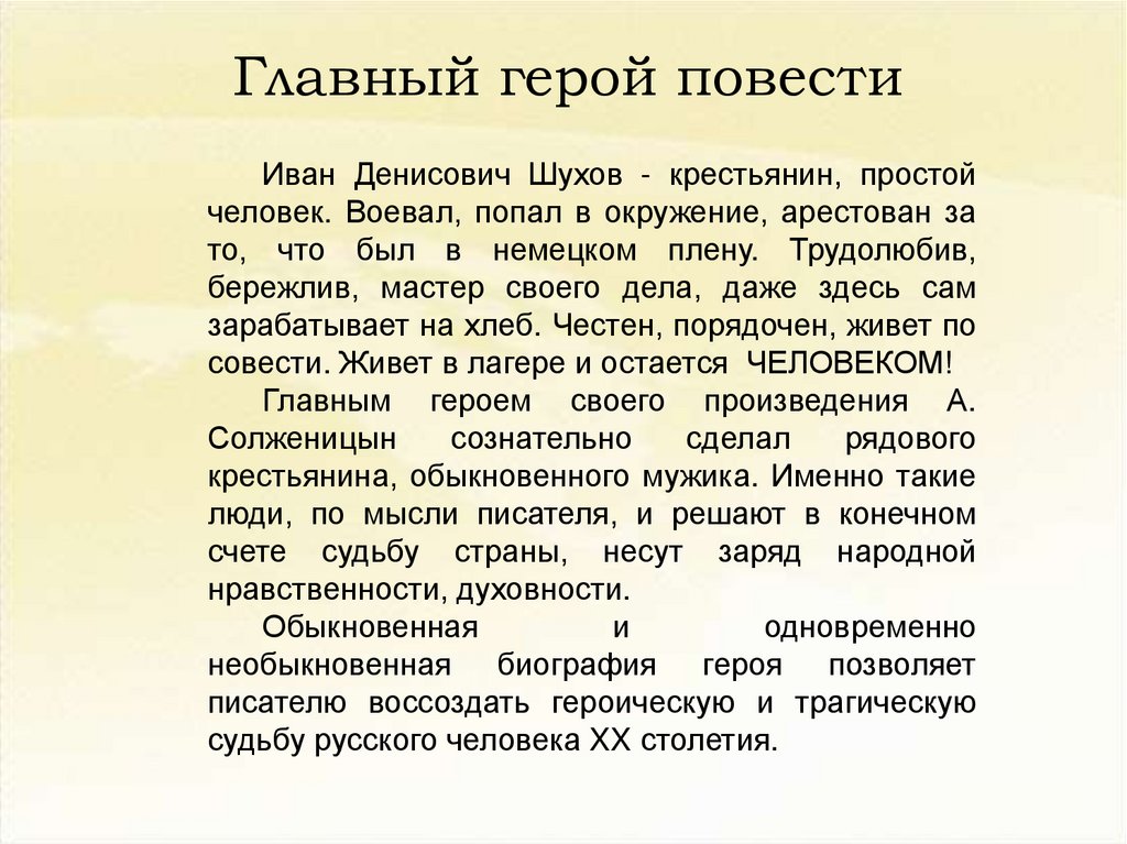 Главный герой повестиИван Денисович Шухов - крестьянин, простой