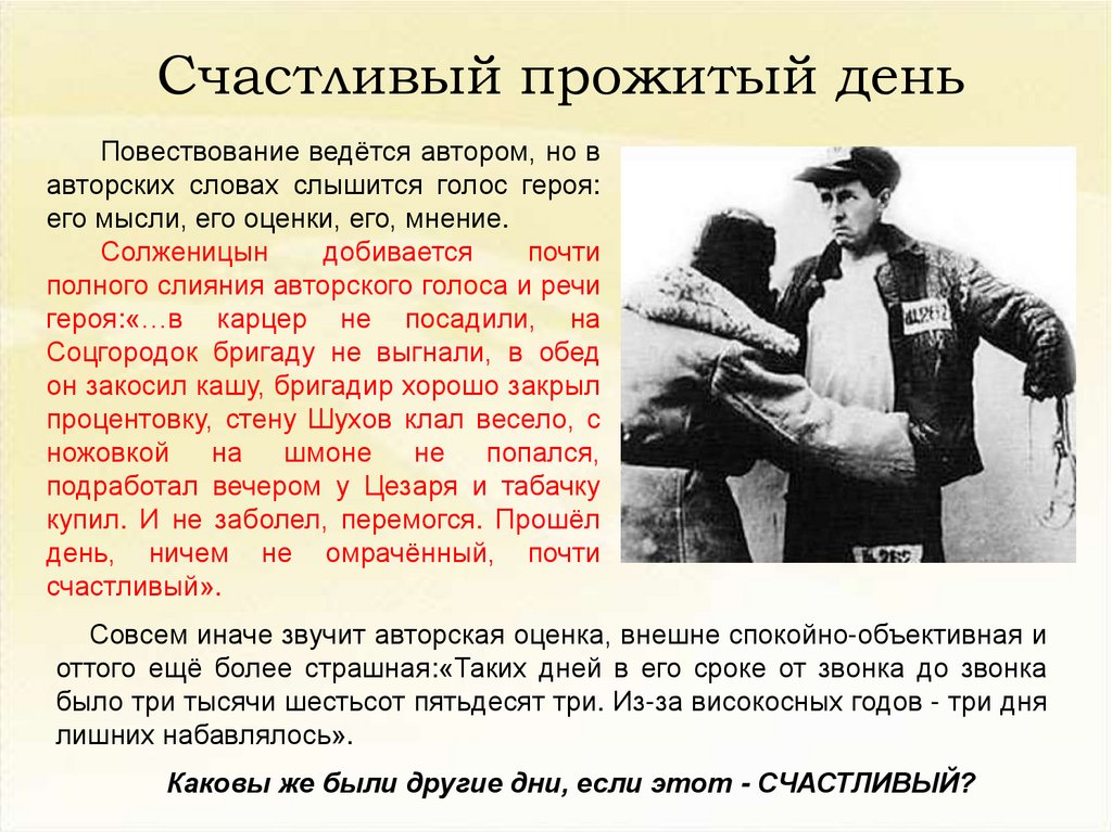Счастливый прожитый деньПовествование ведётся автором, но в