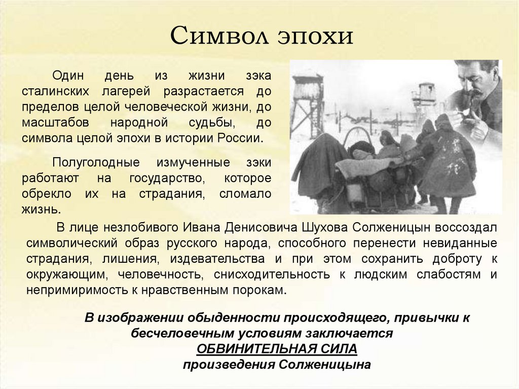 В лице незлобивого Ивана Денисовича Шухова Солженицын воссоздал