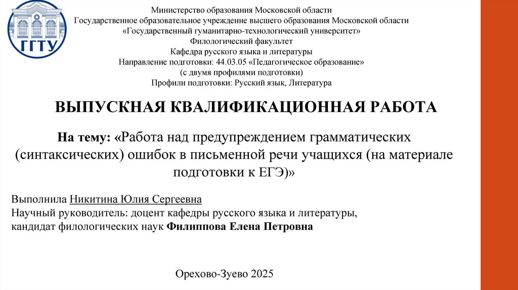 Министерство образования Московской областиГосударственное образовательное учреждение высшего образования Московской области