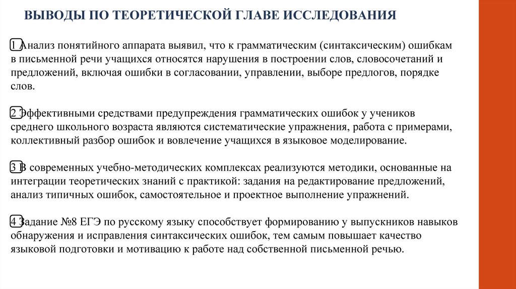 ВЫВОДЫ ПО ТЕОРЕТИЧЕСКОЙ ГЛАВЕ ИССЛЕДОВАНИЯ1 ⃣ Анализ понятийного аппарата выявил, что к грамматическим (синтаксическим) ошибкам
