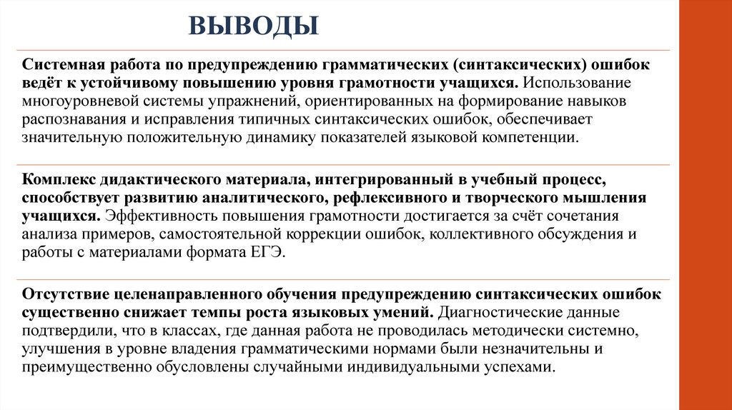 ВЫВОДЫСистемная работа по предупреждению грамматических (синтаксических) ошибок