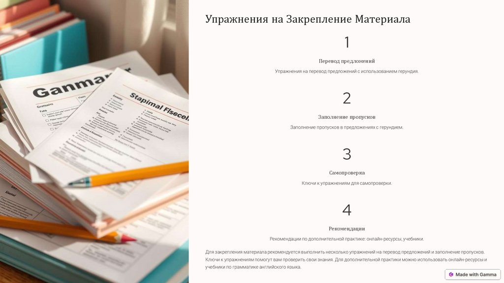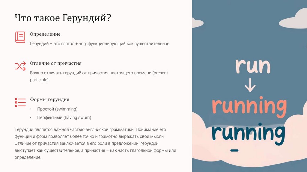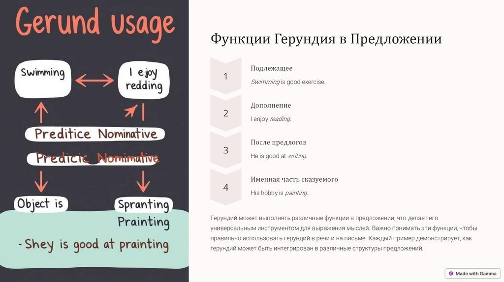 правильно использовать герундий в речи и на письме. Каждый пример демонстрирует, как