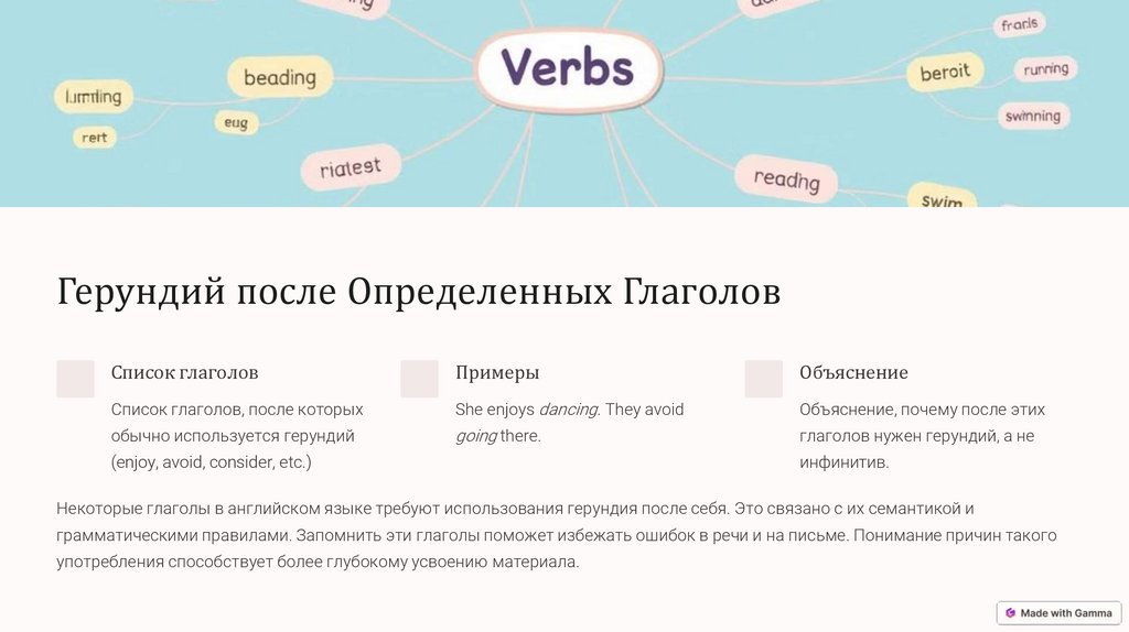 Некоторые глаголы в английском языке требуют использования герундия после себя. Это связано с их семантикой и
