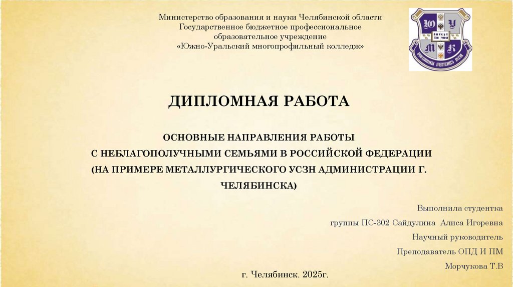 29. ДИПЛОМНАЯ РАБОТА ОСНОВНЫЕ НАПРАВЛЕНИЯ РАБОТЫ С НЕБЛАГОПОЛУЧНЫМИ СЕМЬЯМИ В РОССИЙСКОЙ ФЕДЕРАЦИИ (НА ПРИМЕРЕ МЕТАЛЛУРГИЧЕСКОГО