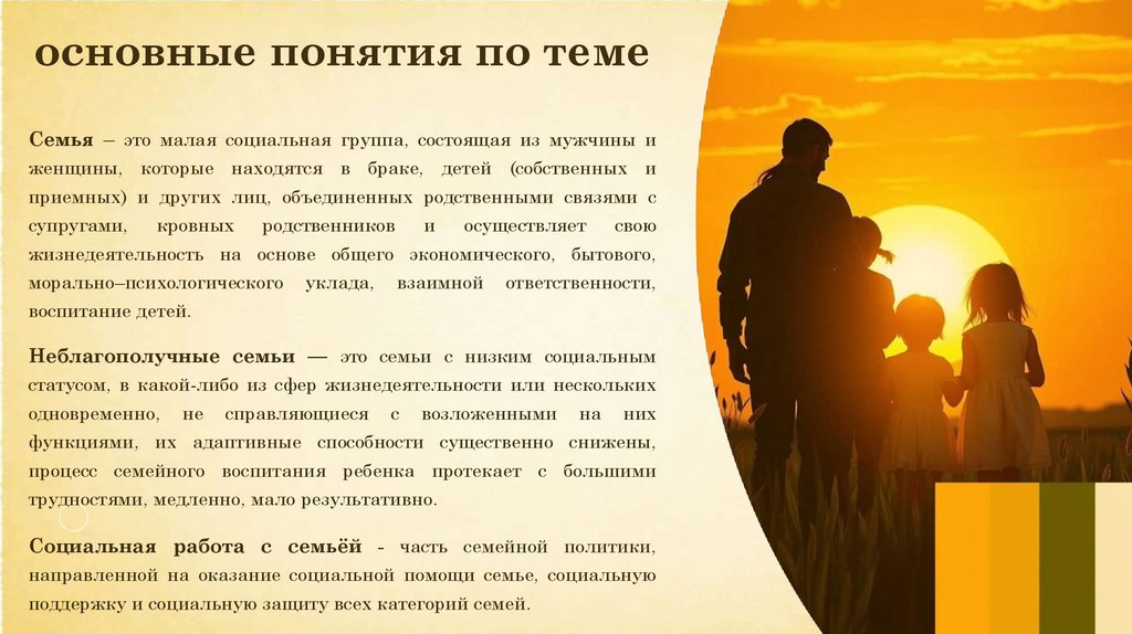 основные понятия по темеСемья – это малая социальная группа, состоящая из мужчины и