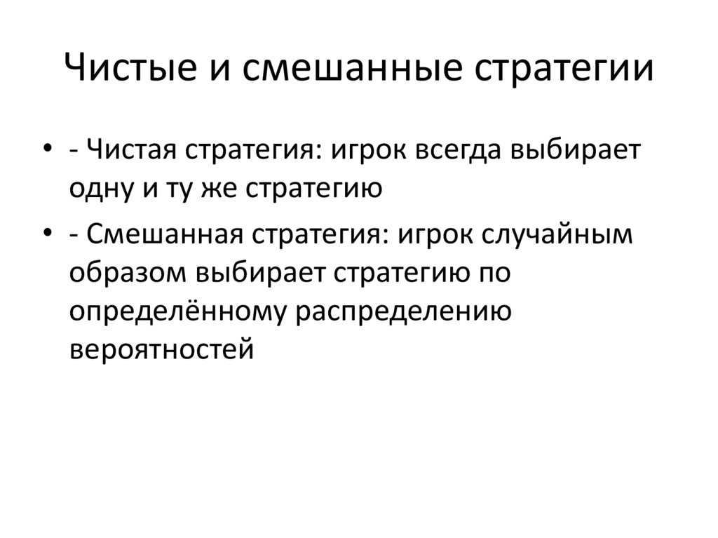 Чистые и смешанные стратегии• - Чистая стратегия: игрок всегда выбирает