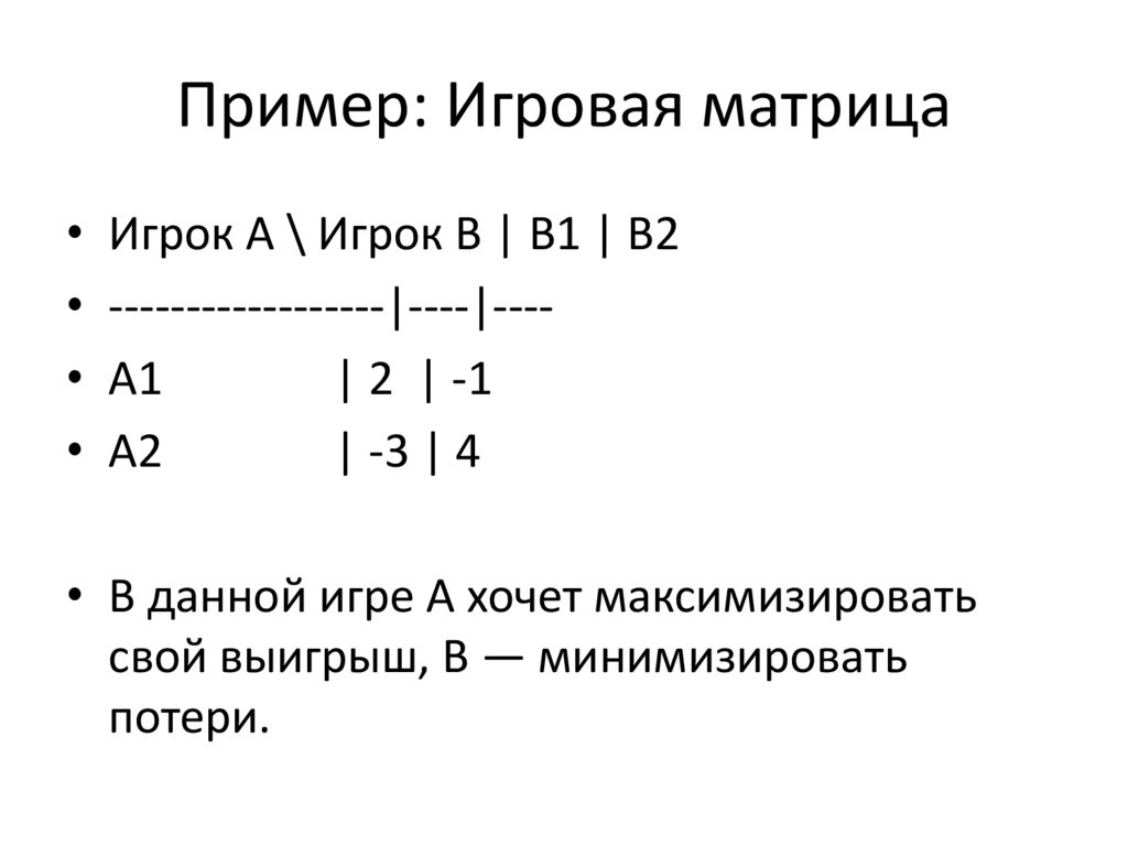 Пример: Игровая матрица• Игрок A \ Игрок B | B1 | B2
