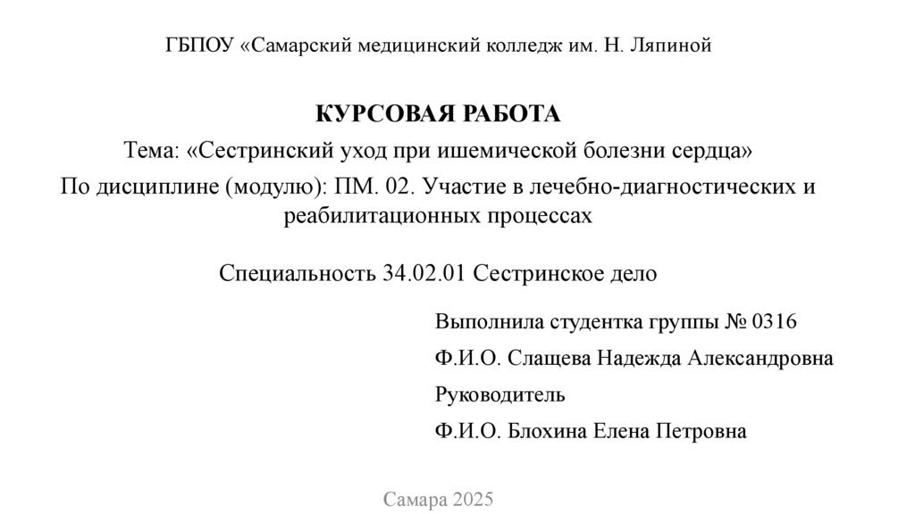 ГБПОУ «Самарский медицинский колледж им. Н. ЛяпинойКУРСОВАЯ РАБОТА