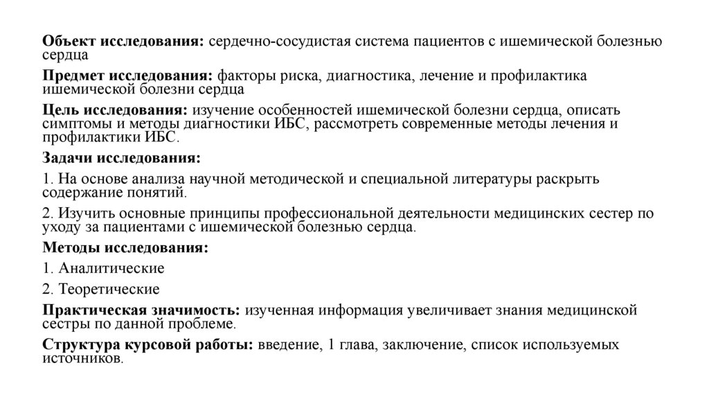 Цель исследования: изучение особенностей ишемической болезни сердца, описать