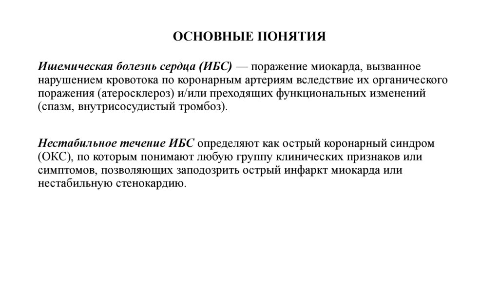 ОСНОВНЫЕ ПОНЯТИЯИшемическая болезнь сердца (ИБС) — поражение миокарда, вызванное