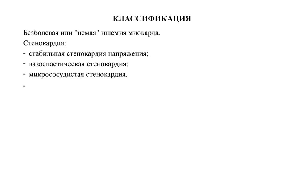 КЛАССИФИКАЦИЯБезболевая или "немая" ишемия миокарда.
