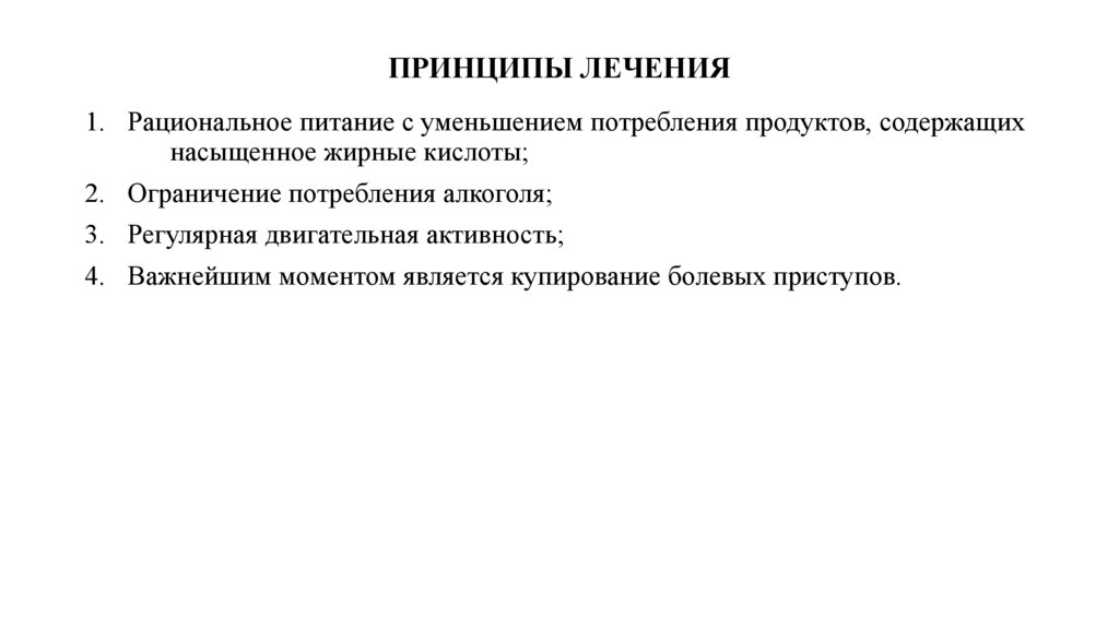 ПРИНЦИПЫ ЛЕЧЕНИЯ1. Рациональное питание с уменьшением потребления продуктов, содержащих
