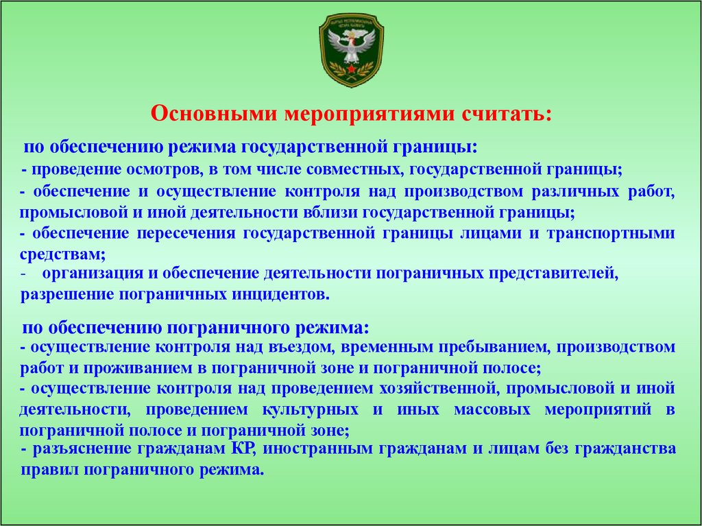 Основными мероприятиями считать:по обеспечению режима государственной границы: