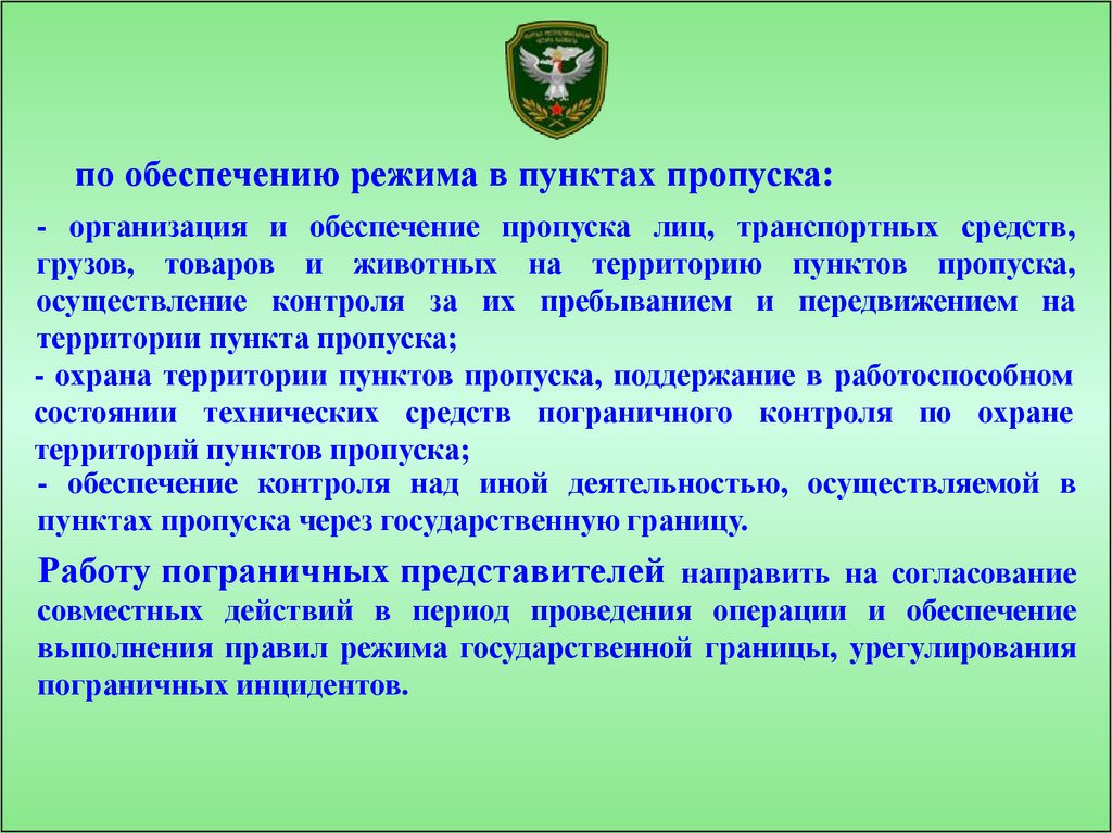 по обеспечению режима в пунктах пропуска:- организация и обеспечение пропуска лиц, транспортных средств,
