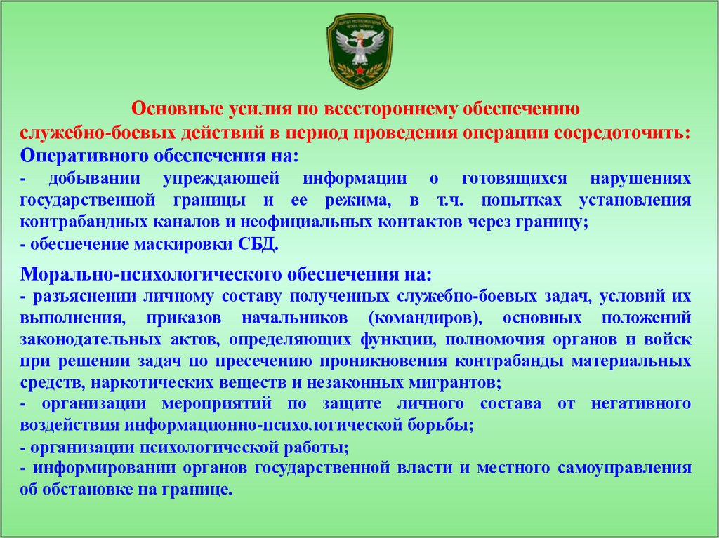 Основные усилия по всестороннему обеспечениюслужебно-боевых действий в период проведения операции сосредоточить: