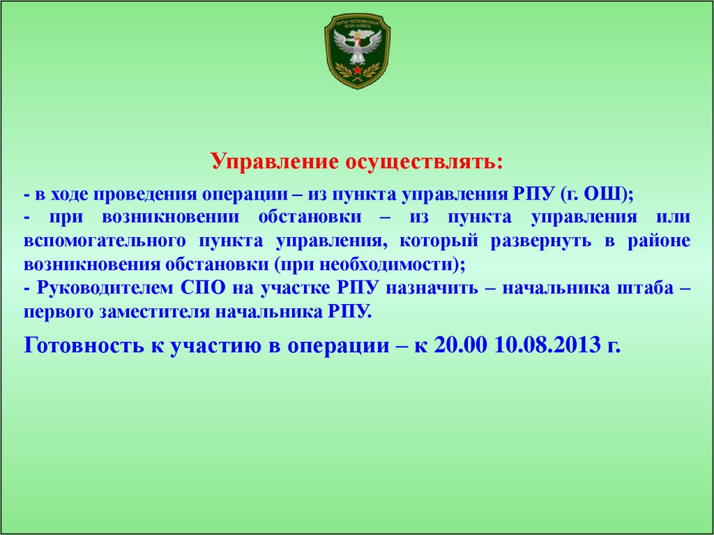 Управление осуществлять:- в ходе проведения операции – из пункта управления РПУ (г. ОШ);