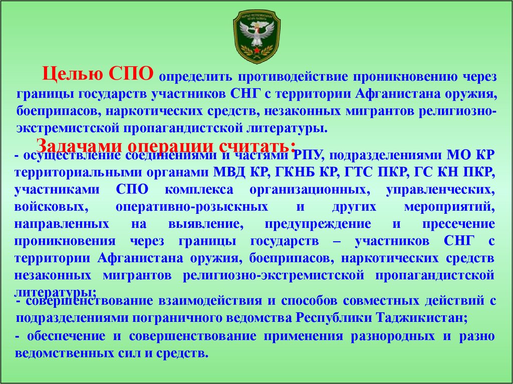 Целью СПО определить противодействие проникновению черезграницы государств участников СНГ с территории Афганистана оружия,