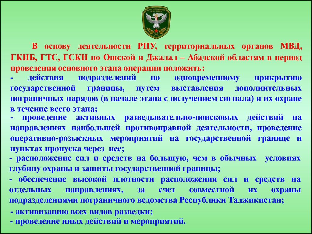 В основу деятельности РПУ, территориальных органов МВД,ГКНБ, ГТС, ГСКН по Ошской и Джалал – Абадской областям в период