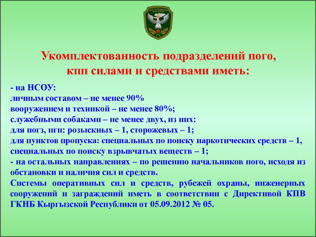 Укомплектованность подразделений пого,кпп силами и средствами иметь: