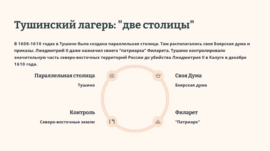 Тушинский лагерь: "две столицы"В 1 6 0 8 -1 6 1 0 годах в Тушино была создана параллельная столица. Там располагались своя Боярская дума и