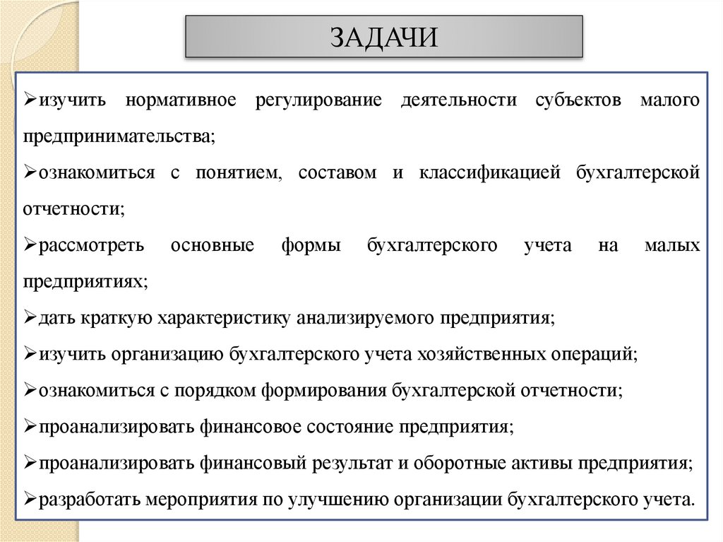 ЗАДАЧИизучить нормативное регулирование деятельности субъектов малого