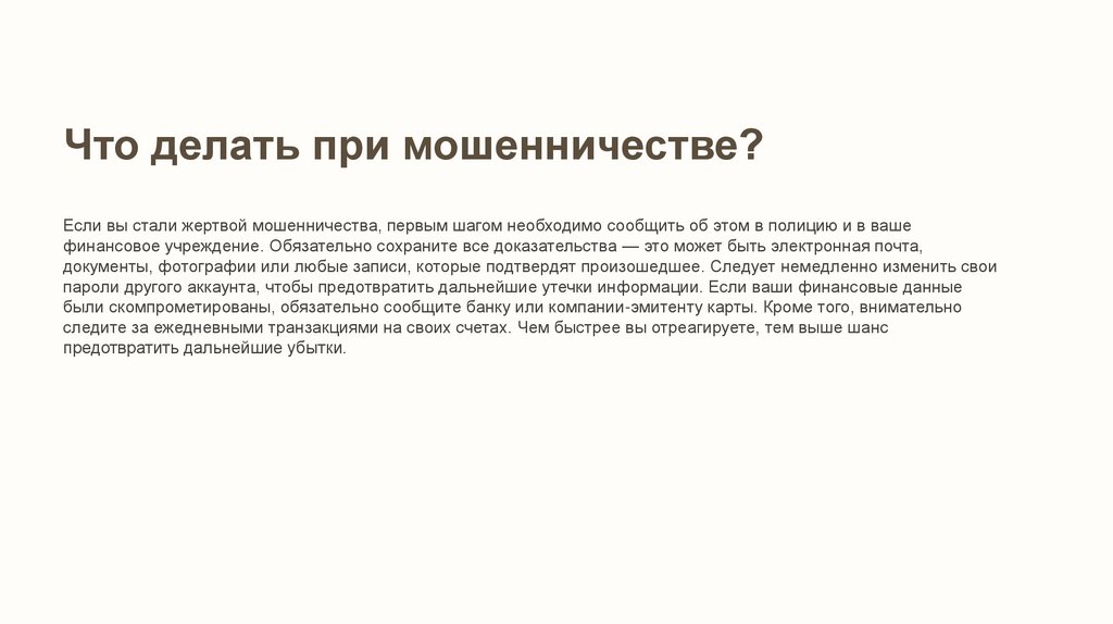 Что делать при мошенничестве?Если вы стали жертвой мошенничества, первым шагом необходимо сообщить об этом в полицию и в ваше