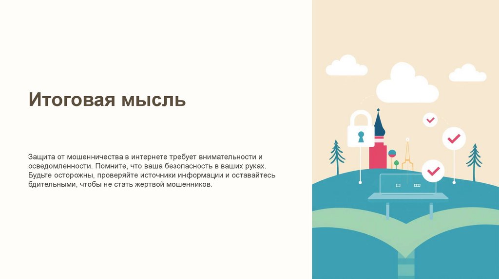 Итоговая мысльЗащита от мошенничества в интернете требует внимательности и