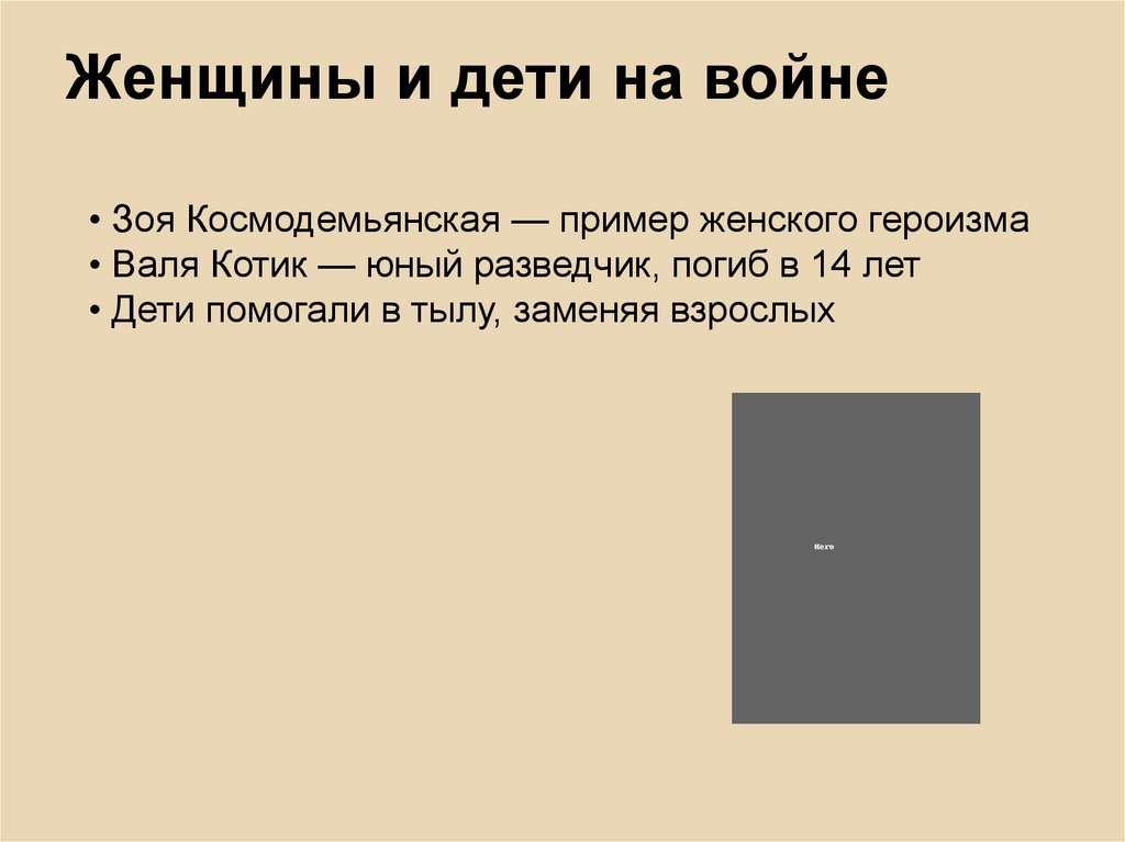 Женщины и дети на войне• Зоя Космодемьянская — пример женского героизма
