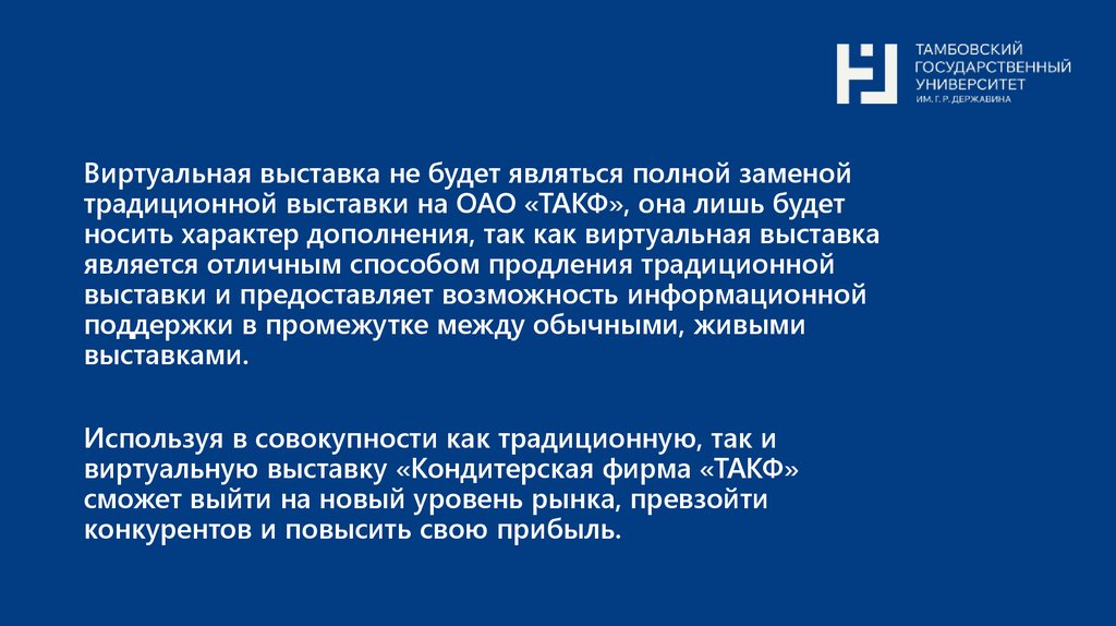 Виртуальная выставка не будет являться полной заменойтрадиционной выставки на ОАО «ТАКФ», она лишь будет