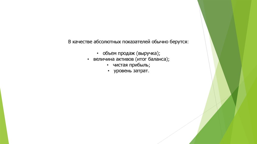 В качестве абсолютных показателей обычно берутся:• объем продаж (выручка);
