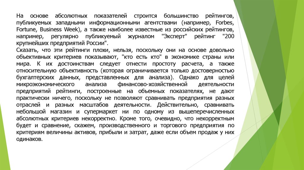 На основе абсолютных показателей строится большинство рейтингов,публикуемых западными информационными агентствами (например, Forbes,