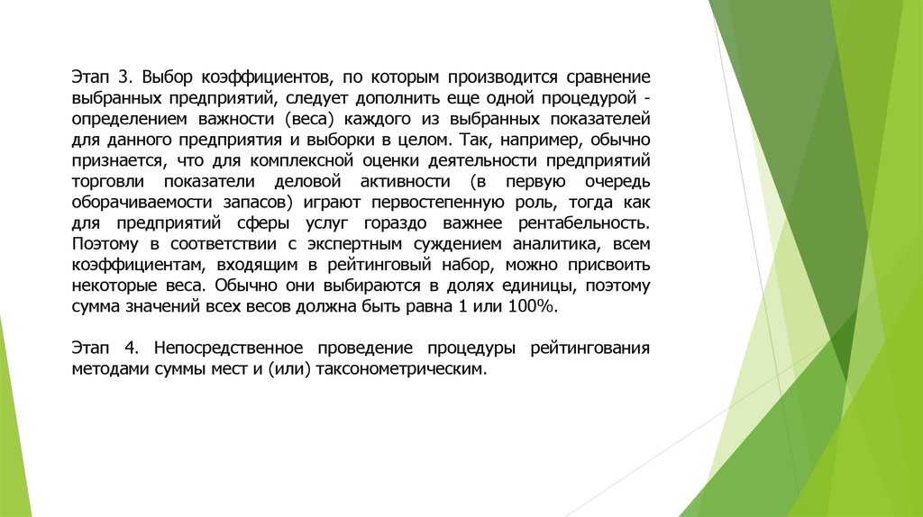 Этап 3. Выбор коэффициентов, по которым производится сравнениевыбранных предприятий, следует дополнить еще одной процедурой определением важности (веса) каждого из выбранных показателей