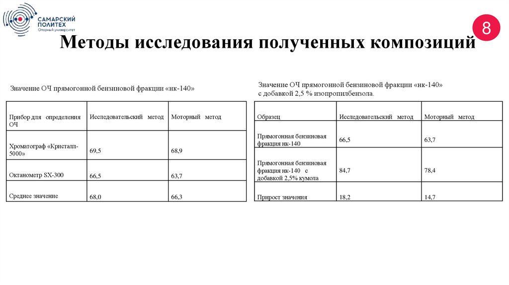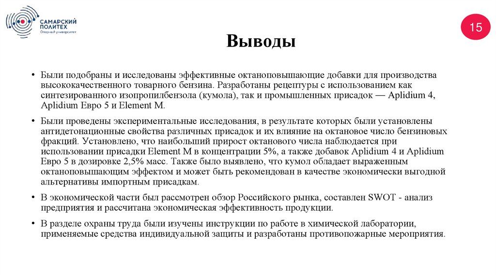 Выводы• Были подобраны и исследованы эффективные октаноповышающие добавки для производства