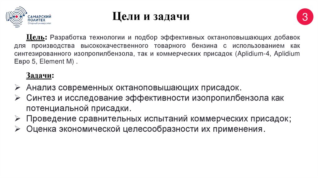 Цели и задачиЦель: Разработка технологии и подбор эффективных октаноповышающих добавок