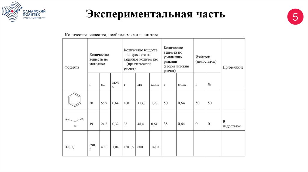 Экспериментальная частьКоличества вещества, необходимых для синтеза
