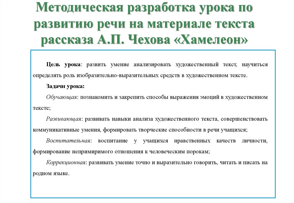 9. Методическая разработка урока по развитию речи на материале текста рассказа А.П. Чехова «Хамелеон»