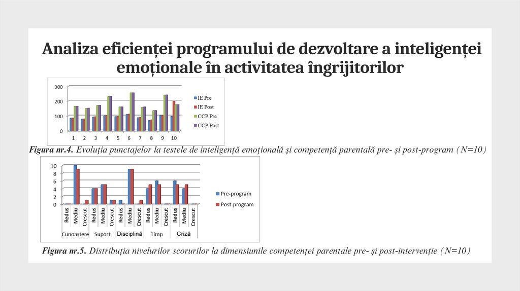 Figura nr.5. Distribuția nivelurilor scorurilor la dimensiunile competenței parentale pre- și post-intervenție (N=10)