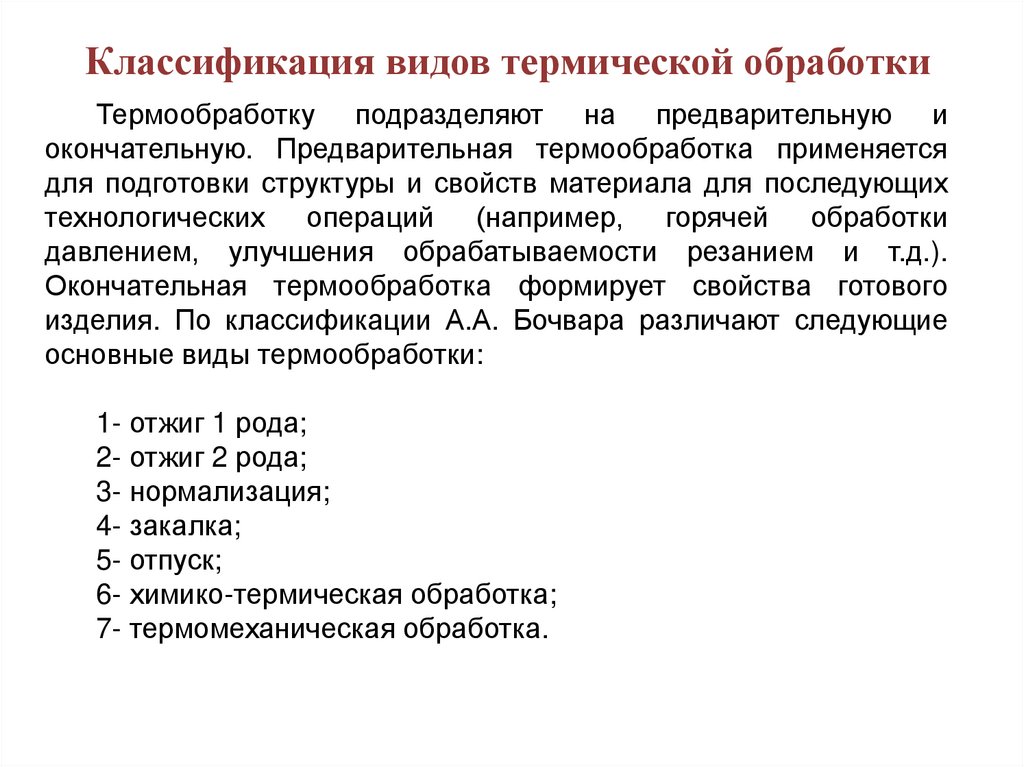 Классификация видов термической обработкиТермообработку подразделяют на предварительную и
