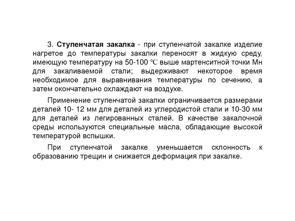 3. Ступенчатая закалка - при ступенчатой закалке изделиенагретое до температуры закалки переносят в жидкую среду,