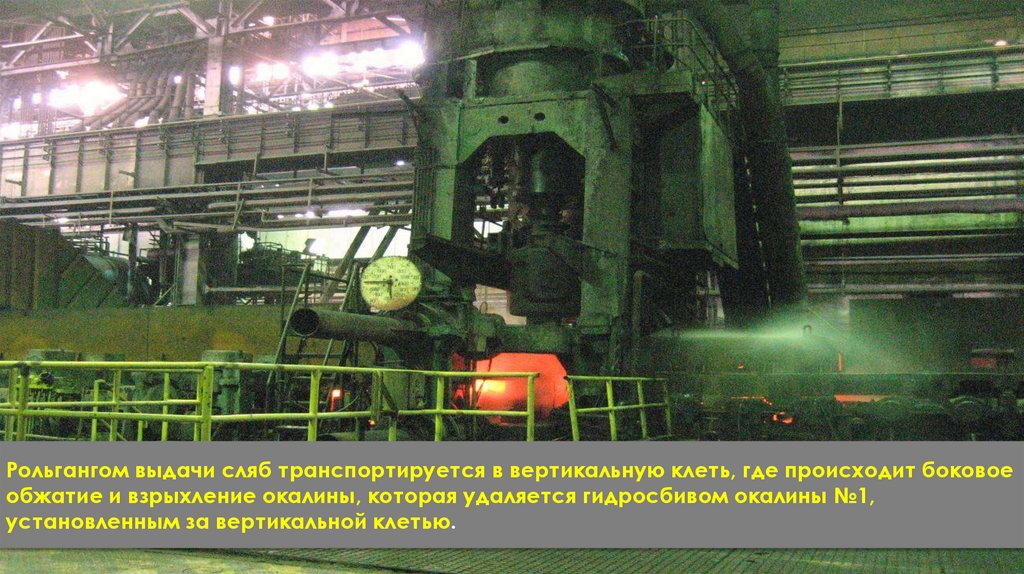 Рольгангом выдачи сляб транспортируется в вертикальную клеть, где происходит боковоеобжатие и взрыхление окалины, которая удаляется гидросбивом окалины №1,