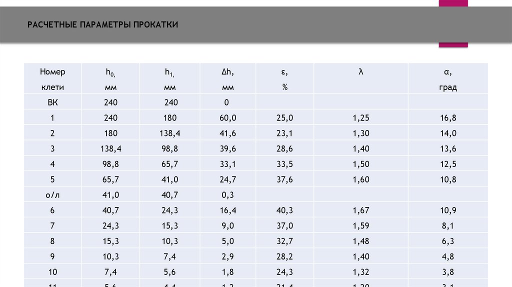 РАСЧЕТНЫЕ ПАРАМЕТРЫ ПРОКАТКИНомер