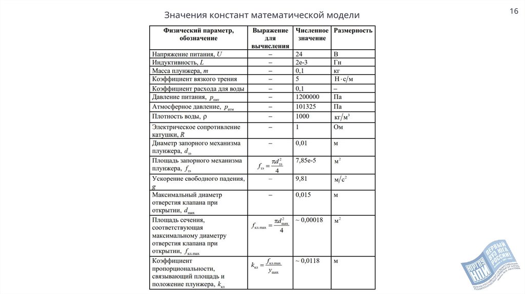 Значения констант математической модели16
