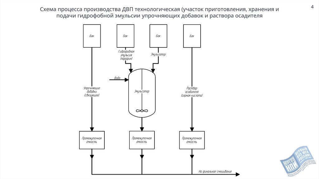 Схема процесса производства ДВП технологическая (участок приготовления, хранения иподачи гидрофобной эмульсии упрочняющих добавок и раствора осадителя