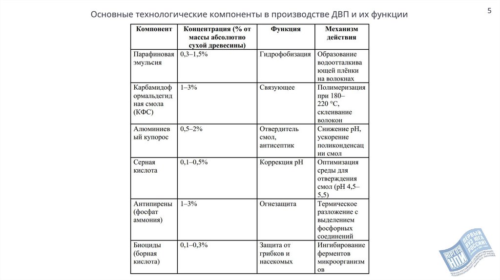 Основные технологические компоненты в производстве ДВП и их функции5