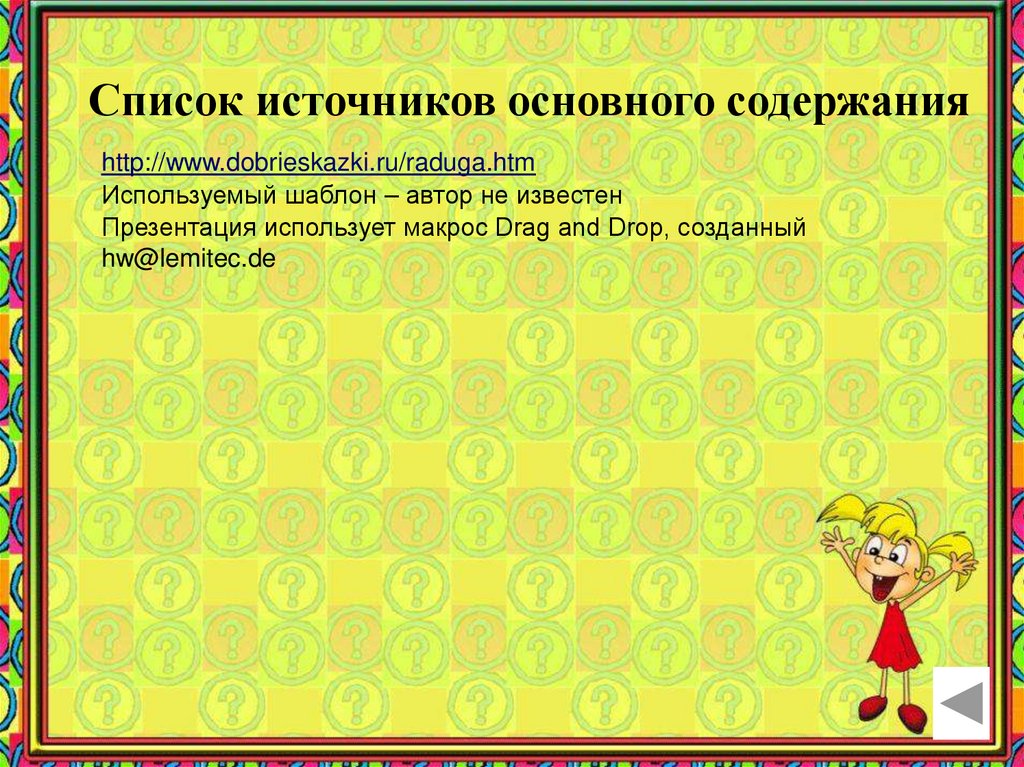 Список источников основного содержанияhttp://www.dobrieskazki.ru/raduga.htm