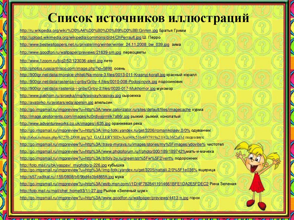 Список источников иллюстрацийhttp://ru.wikipedia.org/wiki/%D0%A4%D0%B0%D0%B9%D0%BB:Grimm.jpg Братья Гримм