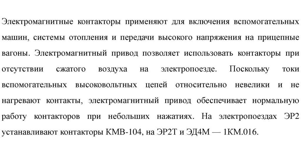 Электромагнитные контакторы применяют для включения вспомогательныхмашин, системы отопления и передачи высокого напряжения на прицепные