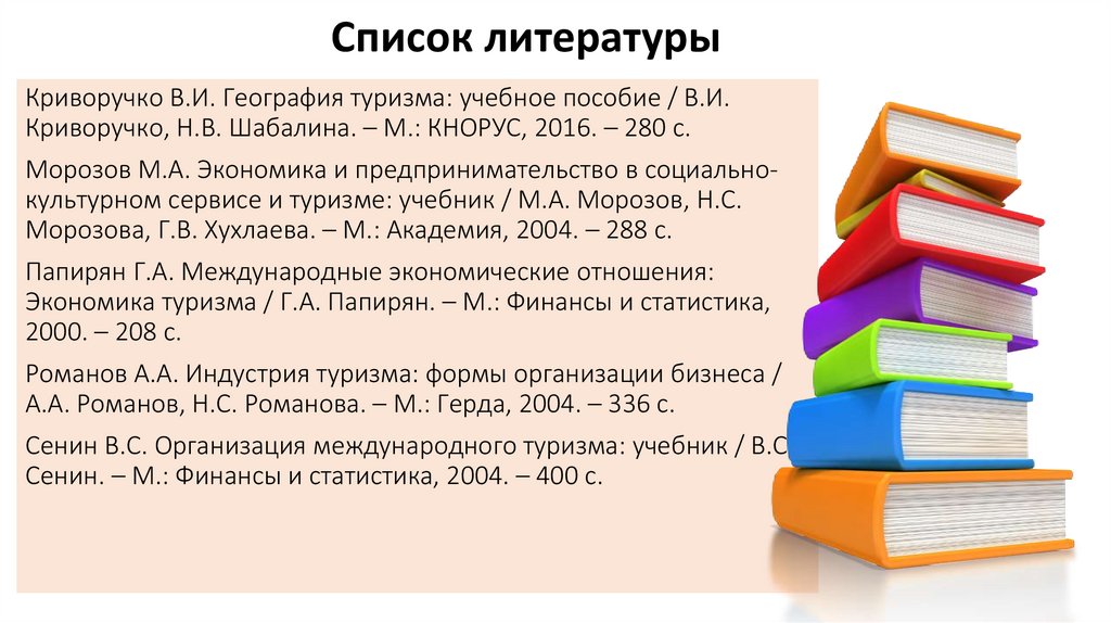 Список литературыКриворучко В.И. География туризма: учебное пособие / В.И.